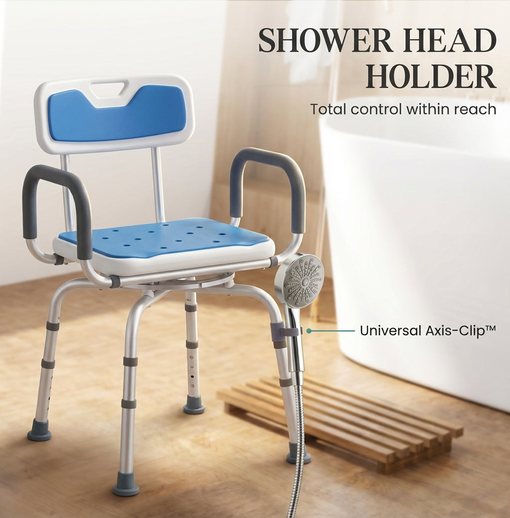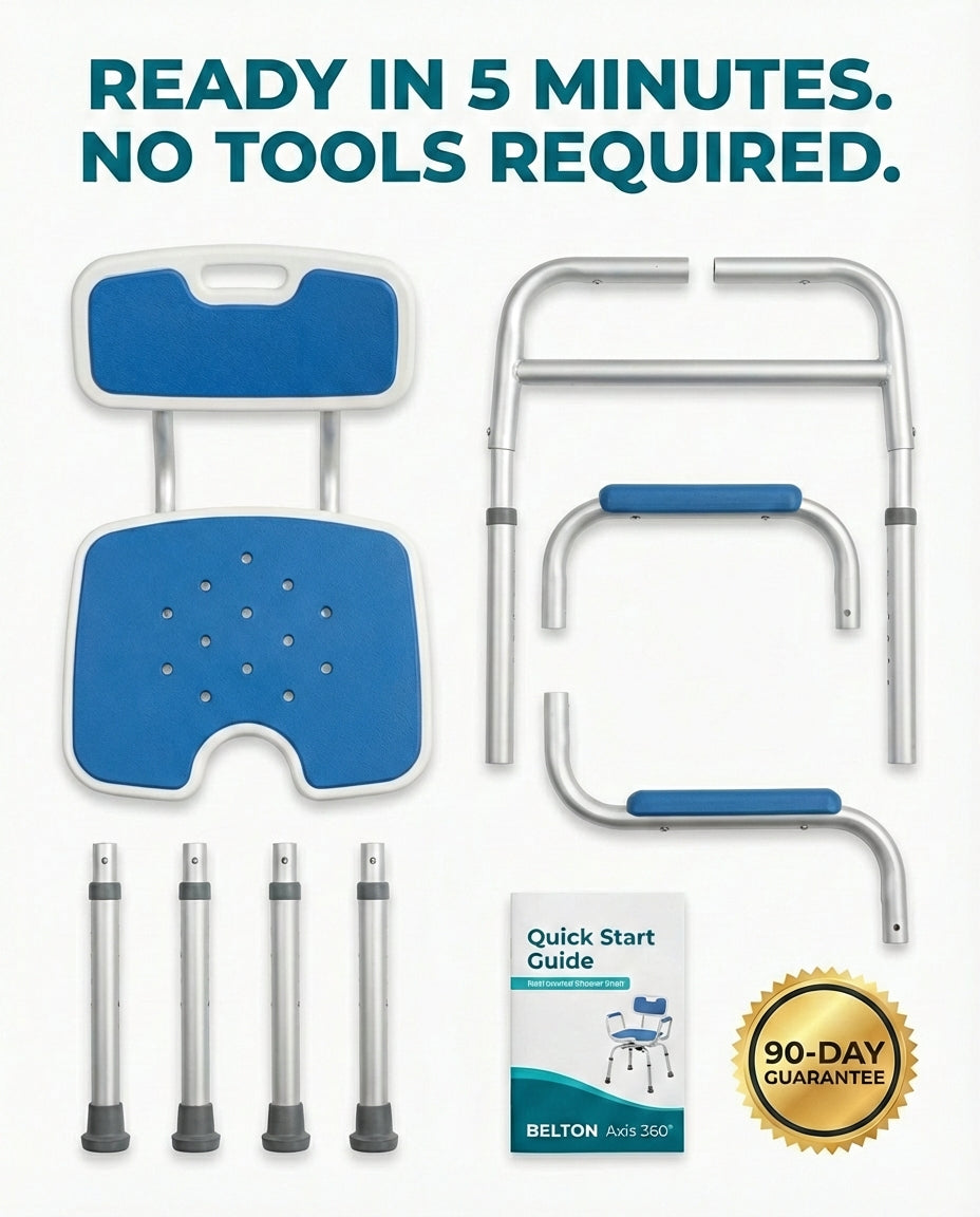 BELTON Axis 360® features a professional-grade swivel base that allows you to sit down outside the tub and glide yourself into position with zero physical strain. By removing the need to step over high tub walls, the Smooth-Glide™ mechanism protects your balance and keeps you perfectly centered. You’ll finish every shower feeling safe, clean, and deeply satisfied.